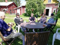 Sää suosi sen verran vierailuamme, että heti lähdettyämme kohti Mirjamin ja Pekan lomapaikkaa, alkoi vettä sataa "kaatamalla". Hyvää tuuria siis. Syy miksi siirryimme Oripään puolelle oli kahvihampaan kolotus. Pekka oli näet luvannut kahvittaa porukan. Sen lisäksi, että nautimme Mirjamin maittavat tarjoilut, saimme tutustua Pekan lapsuuden kotiin, mikä toimii Koivuloiden lomapaikkana.