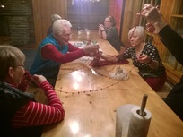 ![]() Pitkän pöydän ääressä maistui poronkäristys sopivien juomien kyydittämänä | ![]() Pöytäkin oli juuri hyvänkokoinen |