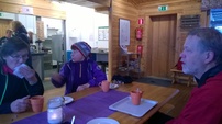 ![]() Hiihtäjät Lampivaaran majan edessä | ![]() Munkkikahveilla Lampivaarassa |