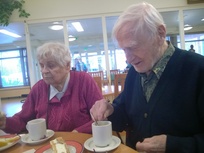 Tampereen alaosaston väkeä vieraili Tammenlehväkeskuksen kahviossa tapaamassa Tammenlehväkodissa asuvia, pitkään jäseneinä olleita Irja ja Ville Himasta. He viihtyvät siellä hyvin ja palveluita on saatavana tarpeen mukaan laidasta laitaan.