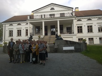 ![]() Liisa Lagerstam kertoi Laukon kartanon historiaa asiantuntevasti ja eloisasti alaosaston 22 osallistujalle | ![]() Porukka yhteiskuvassa kartanon päärakennuksen edessä |