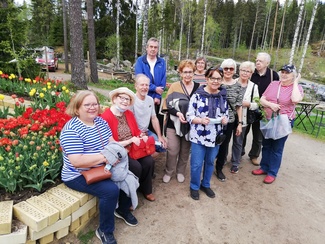 ![]() Koko 11 hengen porukka kuvassa tulppaanien äärellä |