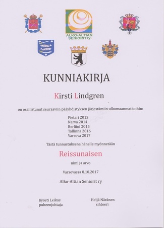 Kirsti Lindgren nimitettiin Varsovassa 8.10.2017 Alko-Altian Seniorit ry:n Reissunaiseksi.