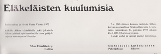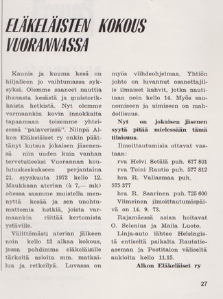 Eläkeläisille Pulloposti oli taas luovuttanut takakantensa. Nimimerkki S.J. kirjoitti 75 osanottajan voimin tehdystä Ähtärin matkasta. Eläinpuiston jälkeen oli majoituttu Mesikämmeneen, jossa seurusteltiin vilkkaasti ja tanssittiin pikkutunneille saakka.