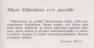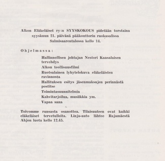 Alkon Eläkeläiset ry:n vuosikokous pidettiin ravintola Jukolassa Rajamäelle 10.4.1969.