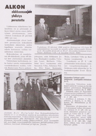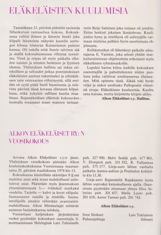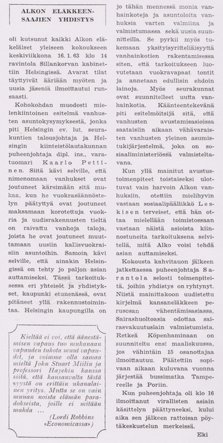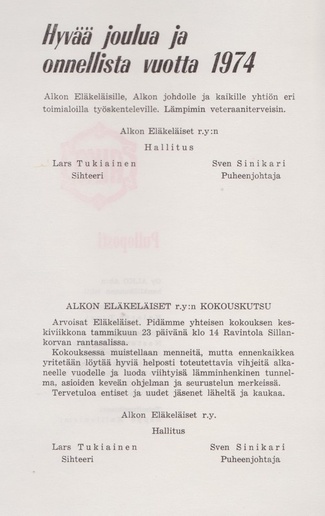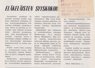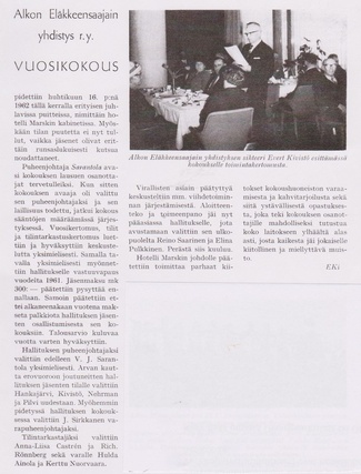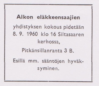 Oheinen pieni juttu oli vuoden 1960 Pullopostin kolmannessa numerossa. Artikkelin mukaan Alkon Eläkkeensaajain Yhdistyksen perustava kokous pidettiin 27.5.1960 ja siihen osallistui 49 eläkeläistä.