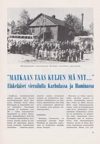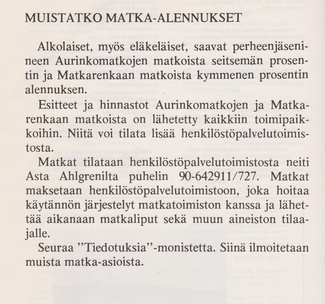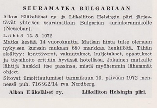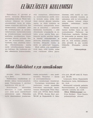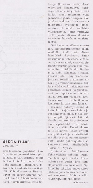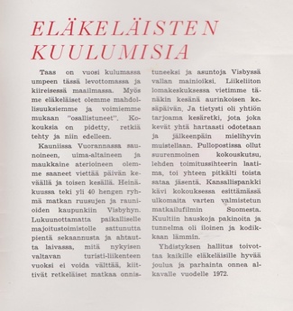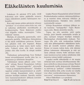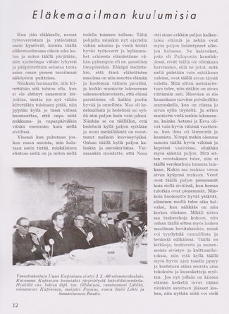 Eläkeläisille Pulloposti oli taas luovuttanut takakantensa. Nimimerkki S.J. kirjoitti 75 osanottajan voimin tehdystä Ähtärin matkasta. Eläinpuiston jälkeen oli majoituttu Mesikämmeneen, jossa seurusteltiin vilkkaasti ja tanssittiin pikkutunneille saakka.