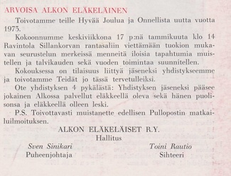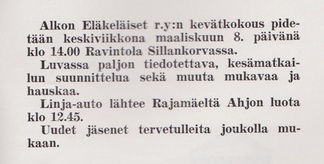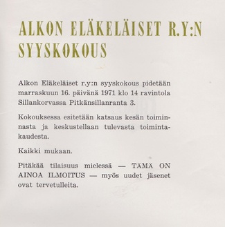 Alkon Eläkeläiset ry:n vuosikokous pidettiin ravintola Jukolassa Rajamäelle 10.4.1969.