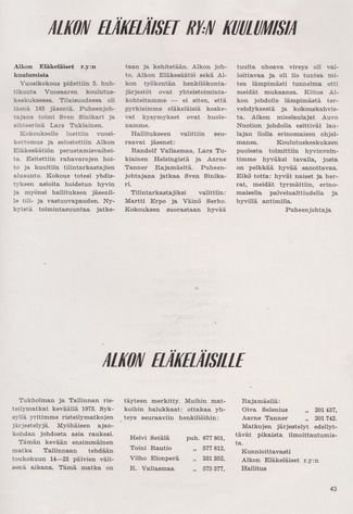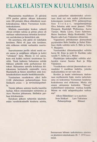 Alkon Eläkeläiset ry:n vuosikokous pidettiin Vuorannassa 2.5.1978. Puheenjohtajaksi valittiin edelleen Kauko Hartman.