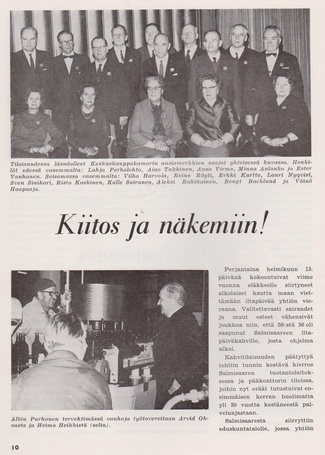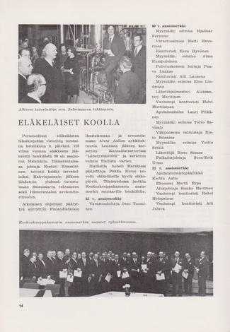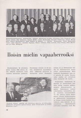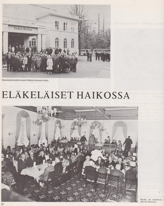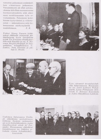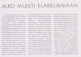 Alkon suhtautumista eläkeläisiinsä kuvaa hyvin allaoleva valokuva. Melkoisen herraseurueen saattelemana läksi varastonhoitaja Uuno Kupiainen eläkkeelle.