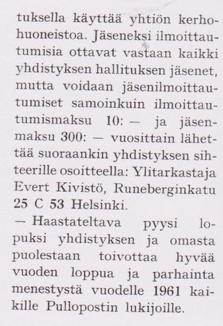 Uuden yhdistyksen ensimmäinen puheenjohtaja Paavo Rautavaara kävi esittelemässä yhdistystä Pullopstin toimituksessa. Hän kertoi 11.10.1960 yhdistysrekisteriin ilmoitetun yhdistyksen toiminnan alkaneen ripeästi. Yleisiä kokouksia oli ehditty pitää jo kolme kertaa. "Kokoushuoneistona on saatu Alkon johdon myötävaikutuksella käyttää yhtiön kerhohuoneistoa" kertoi puheenjohtaja.