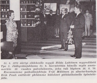 Pulloposti 5 - 1970 uutisoi myyjä Hilda Lahtisen eläköitymisestä myymälästä Tpe 3.