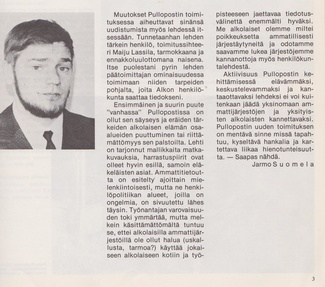 Myös Kta 1:n pääkassa Esteri Lumion eläkkeelle lähtö huomioitiin Pullopostin palstalla. Esteri sai työtovereiltaan "viinipikariston" ja firmalta Madeirat.