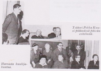 ![]() Istumassa Pentti Kulla, Taru Ryhti, Jarmo Pietiläinen ja Maija Kankainen. Takarivissä Ritva Oksanen, Tauno Miettinen, Pentti Lehtovaara ja Heljä Näränen |