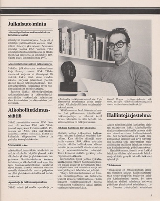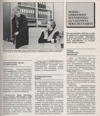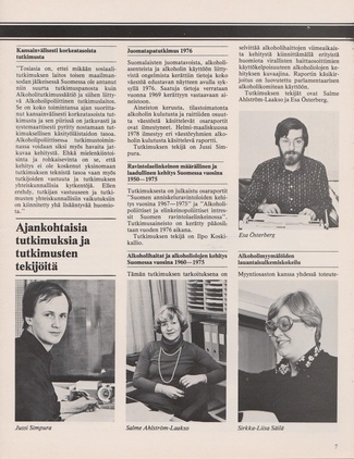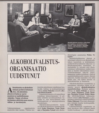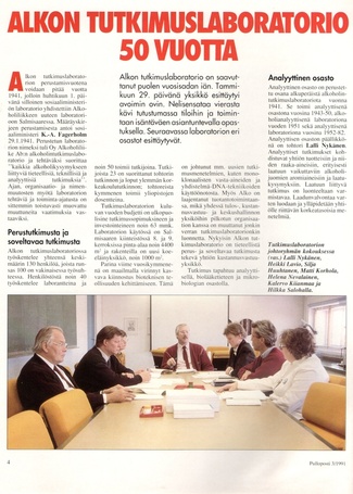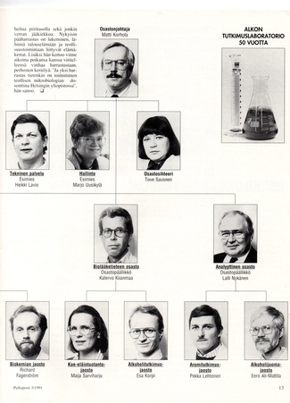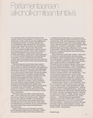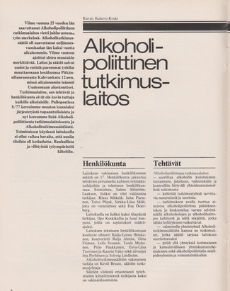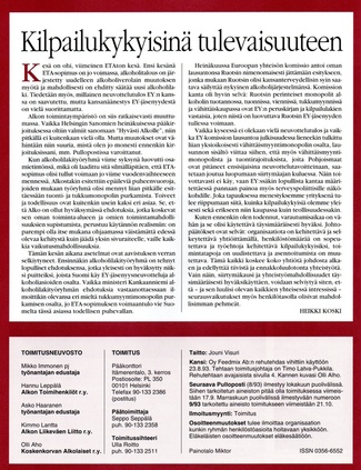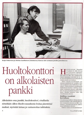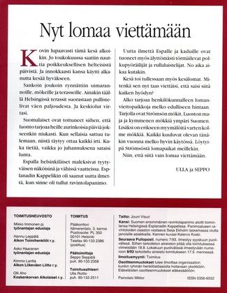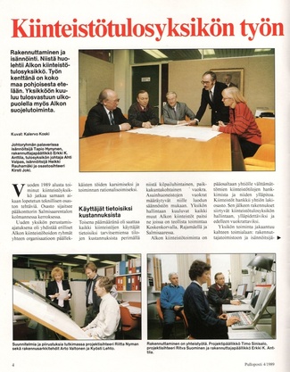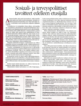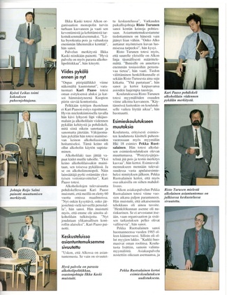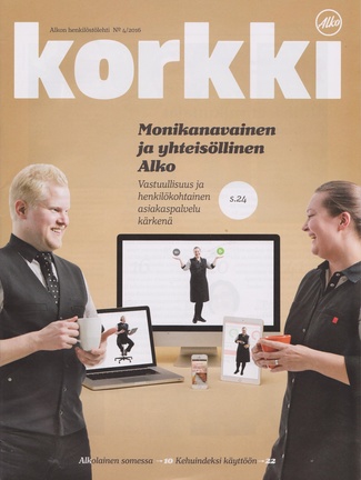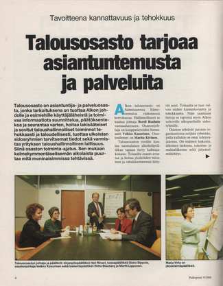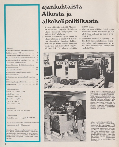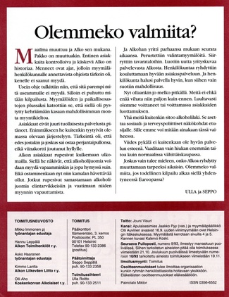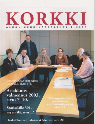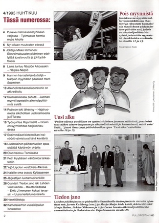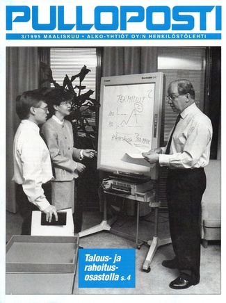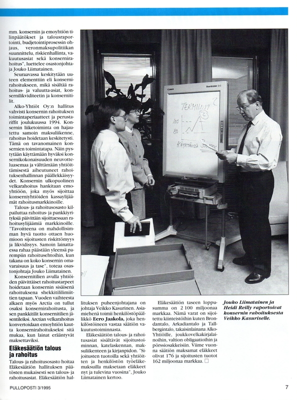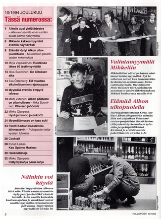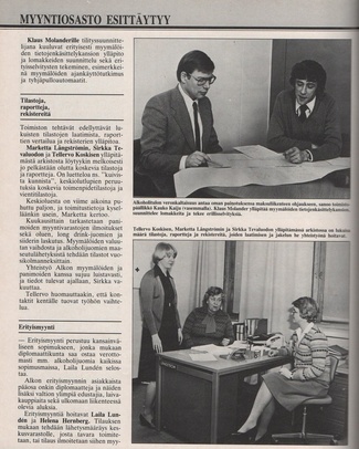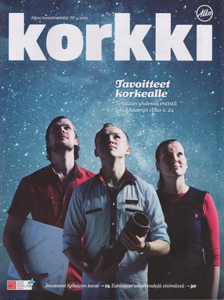 Kansikuvasssa osastonjohtaja Jouko Liimatainen, rahoituspäällikkö Heidi Reilly ja johtaja Veikko Kasurinen. Alko-Yhtiöiden omaisuudesta , taloudesta ja rahoituksesta sivulta 4 alkaen.