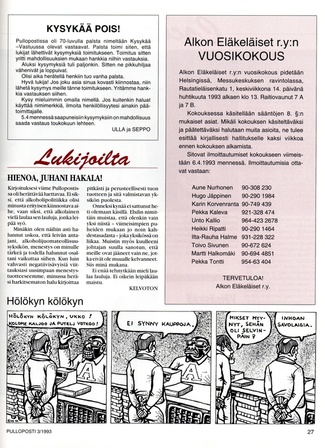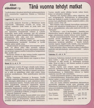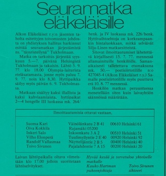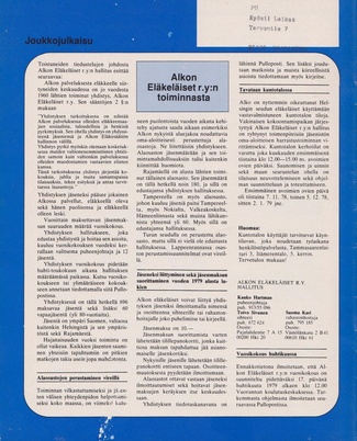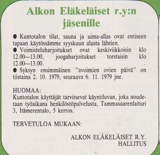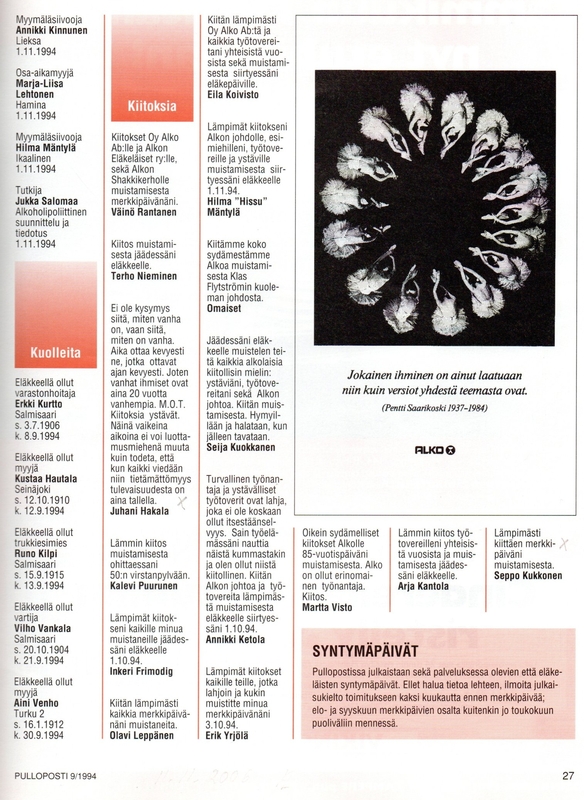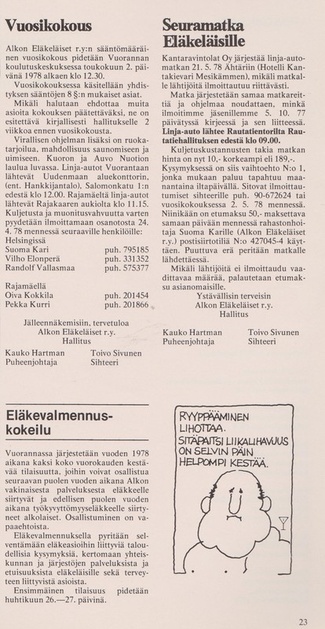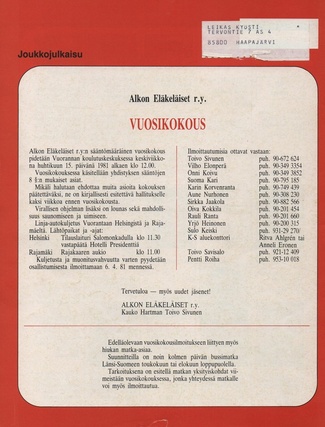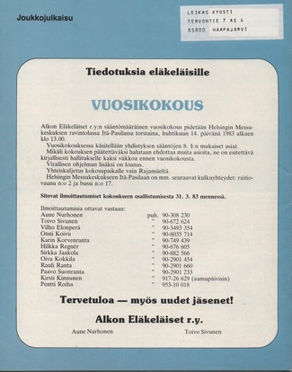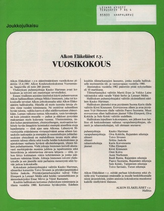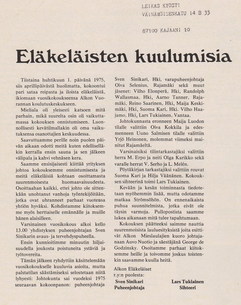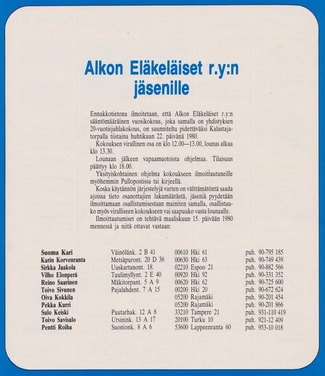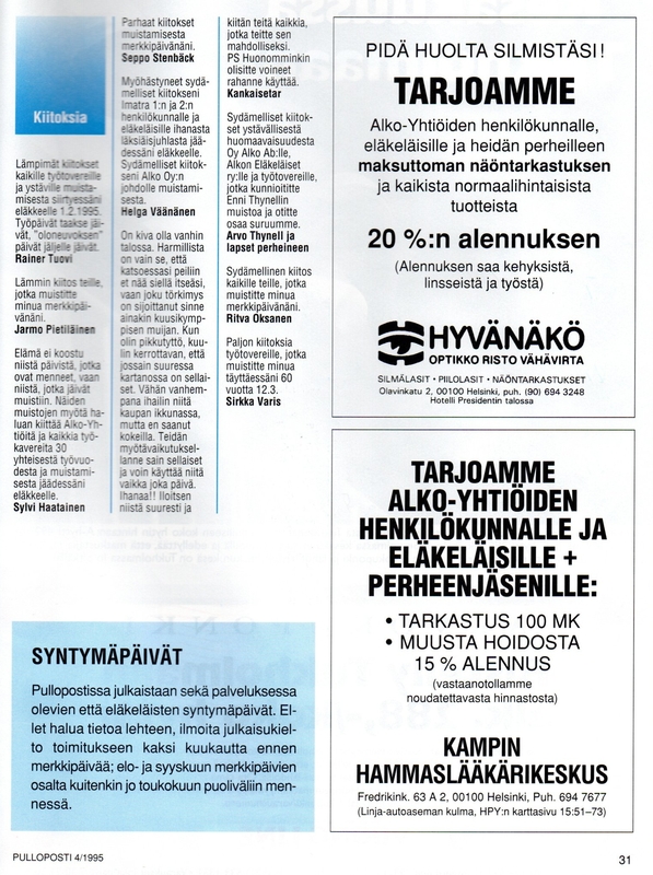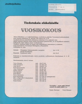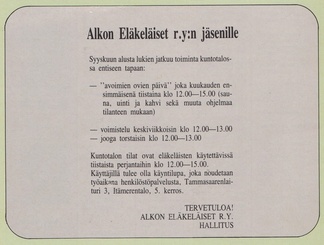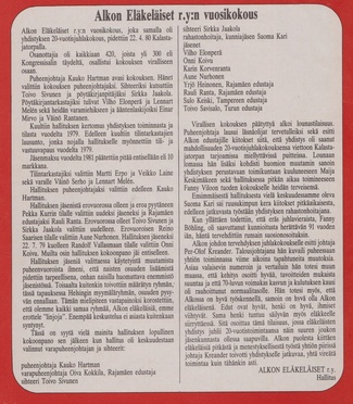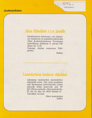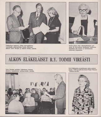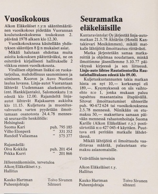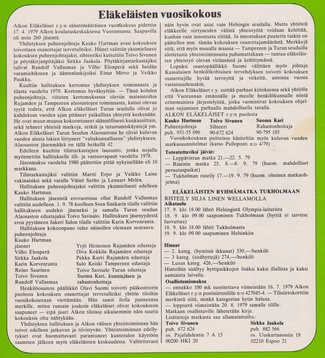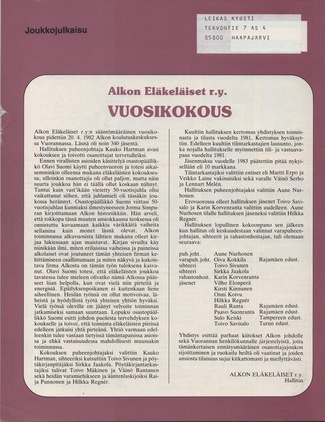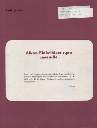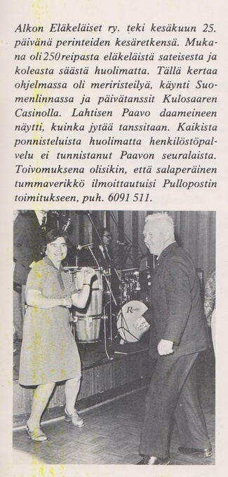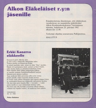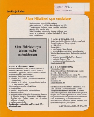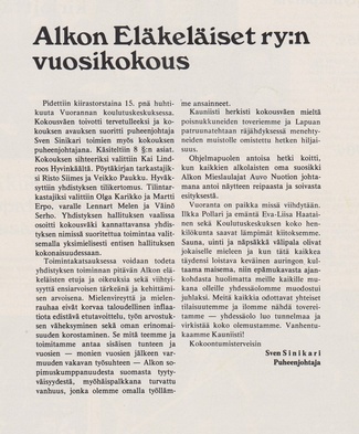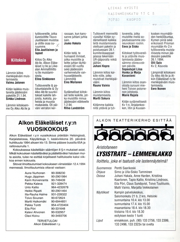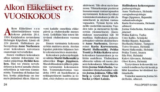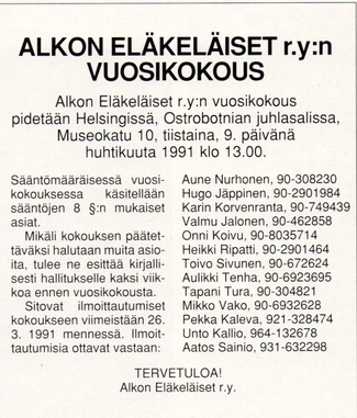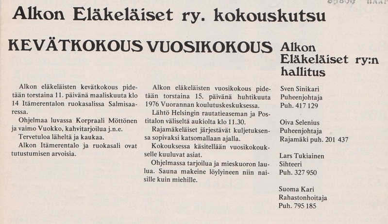 Alkon Eläkeläiset ry sai taas Pullopostin takasivulta palstatilaa kevät- ja vuosikokousilmoitukselleen. Kevätkokous pidettiin Itämerentalon ruokalassa ja vuosikokous Vuorannassa. Vuosikokousasioiden lisäksi ohjelmassa oli "tarjoilua, mieskuoron laulua ja sauna makeine löylyineen."
