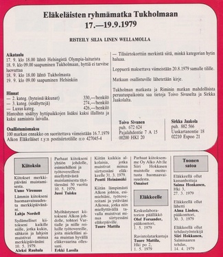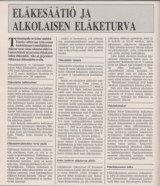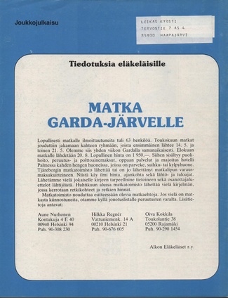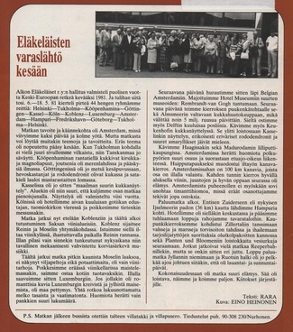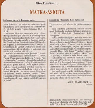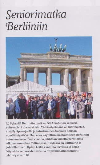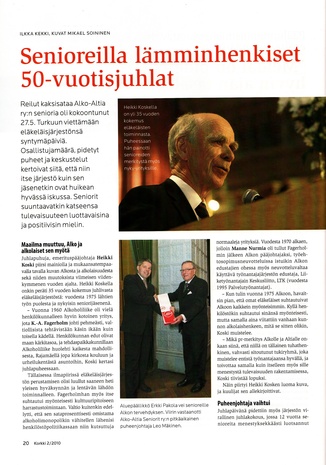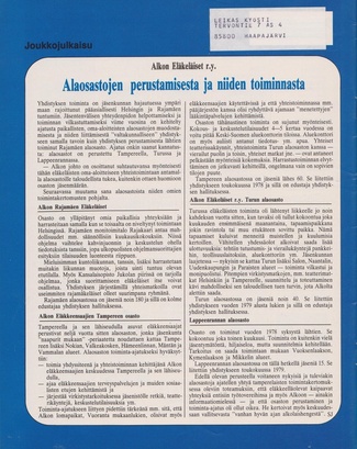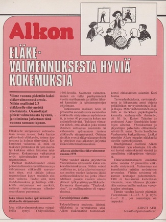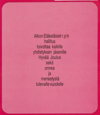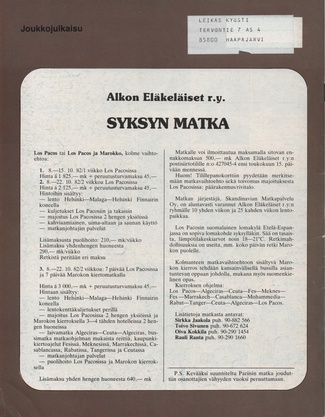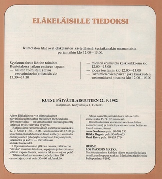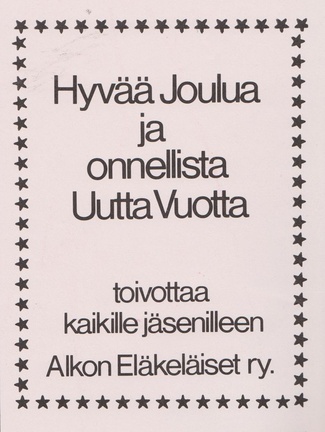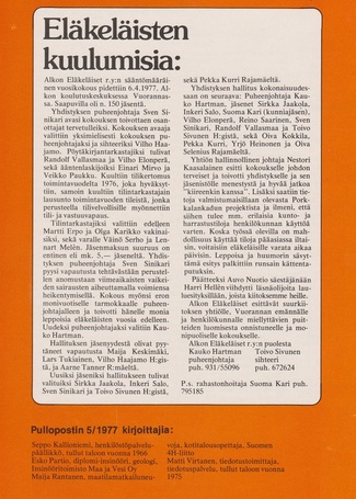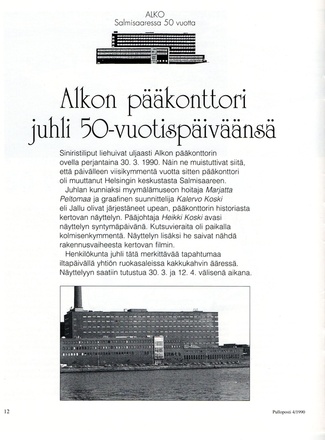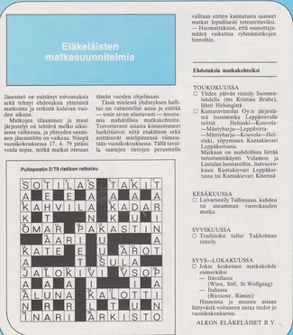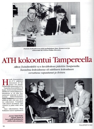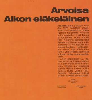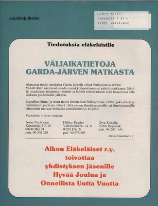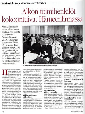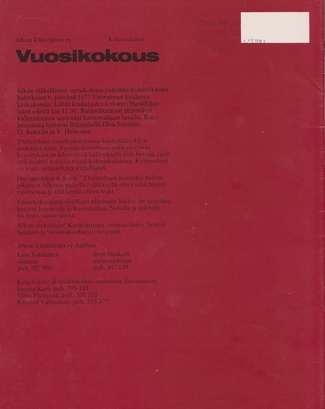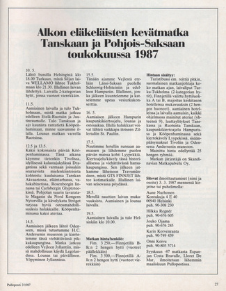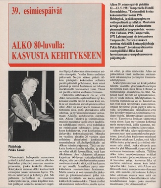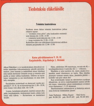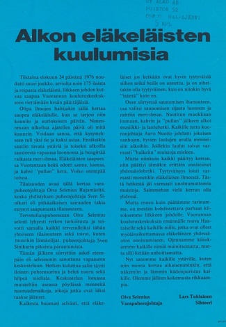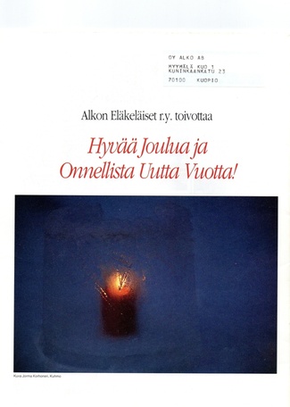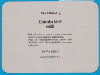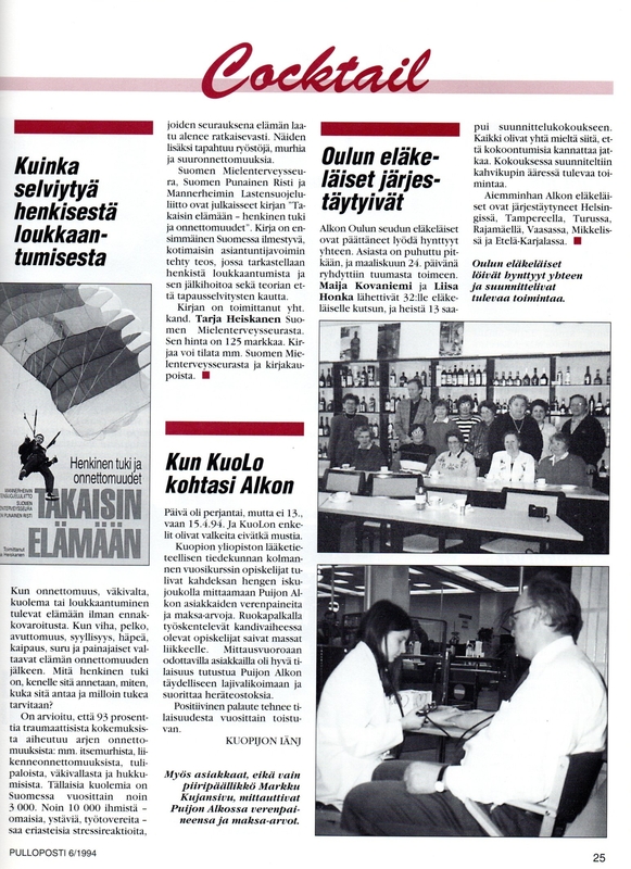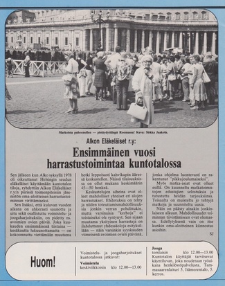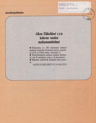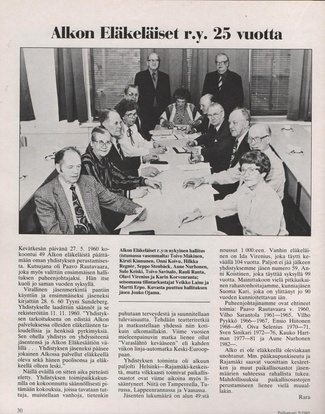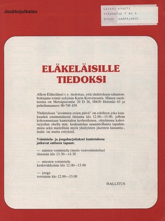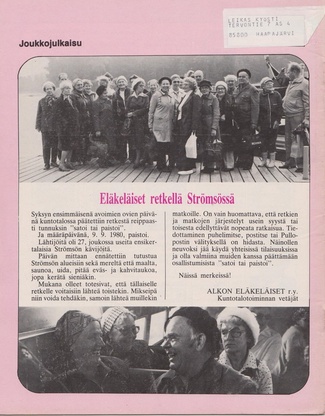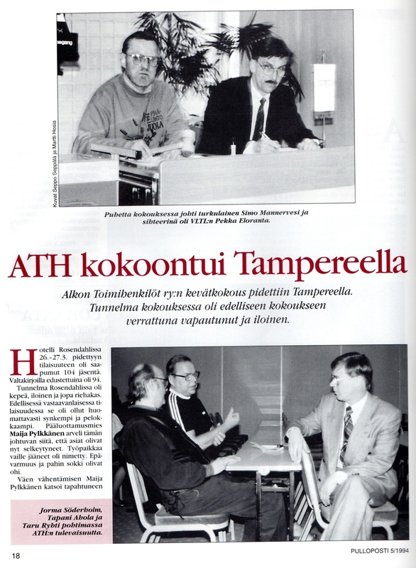 Alkon Eläkeläiset ry sai taas Pullopostin takasivulta palstatilaa kevät- ja vuosikokousilmoitukselleen. Kevätkokous pidettiin Itämerentalon ruokalassa ja vuosikokous Vuorannassa. Vuosikokousasioiden lisäksi ohjelmassa oli "tarjoilua, mieskuoron laulua ja sauna makeine löylyineen."