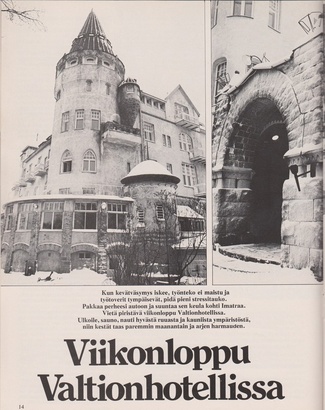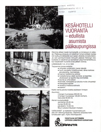 Samalta aukeamalta voi haikeana lukea, kuinka vieraisiin käsiin joutunut Vuoranta mainostaa itseään lomahotellina.
