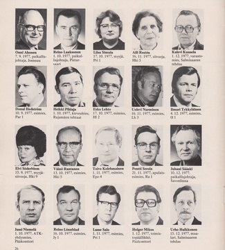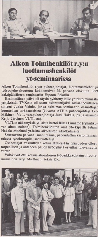 Toinen kuva on vuodelta 1975. Silloin Alkon koulutus oli siirtynyt jo Vuorantaan. Näistä testien läpäisemistä herroista oli tuleman Alkoon esimiehiä. Tässäkään porukassa ei ollut ainoatakaan naista. Valmennettavien asut olivat jo huomattavan rennot ja vain harvoilla oli enää pikkutakkia, kravattia tuskin kellään.