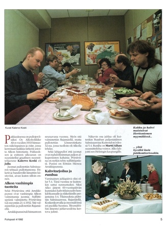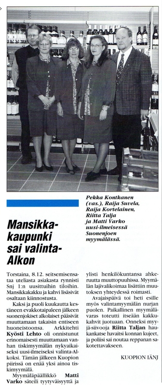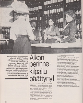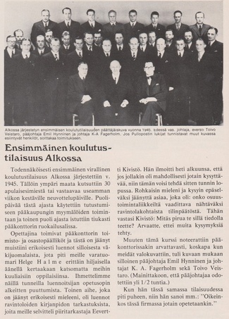 Alkon perinnekilpailun voitti Mikkelin eläkkeellä ollut paikallisjohtaja Eino Vahvaselkä. Laajahkossa kirjoituksessaan hän muistelee Mikkelin Alkon ensivaiheita ja samalla koko yhtiön alkuaikoja. Oheisena kuvaus Alkon ensimmäisestä koulutustilaisuudesta. Tyvestä on lähdetty puuhun kiipeämään!