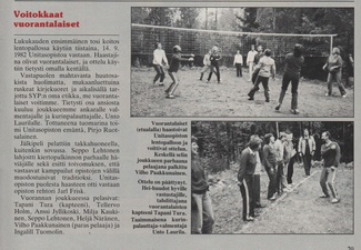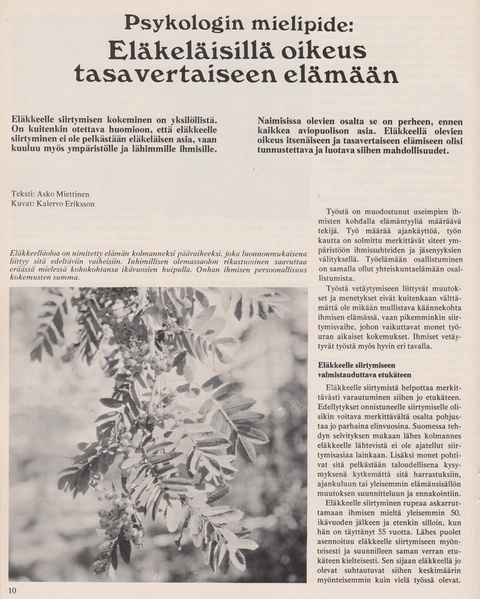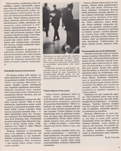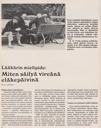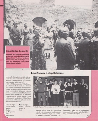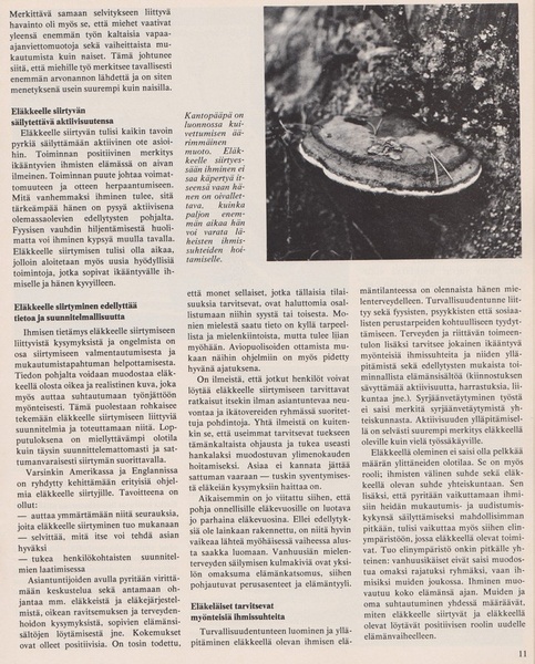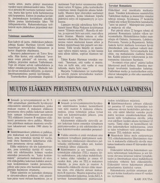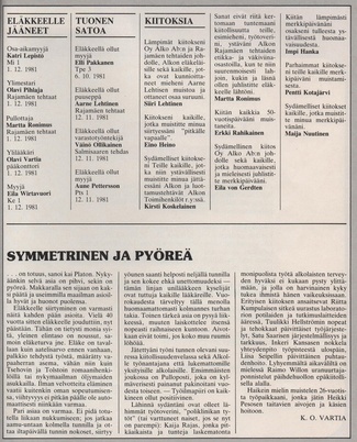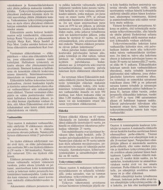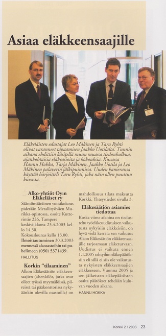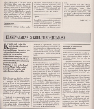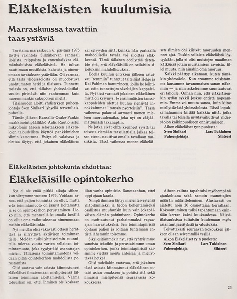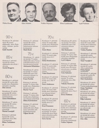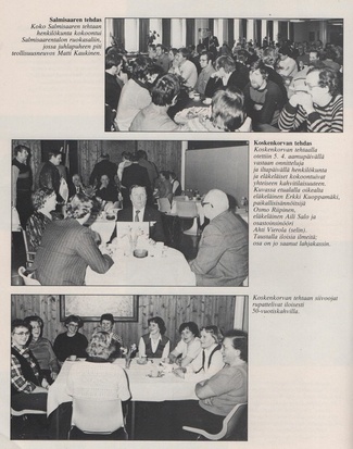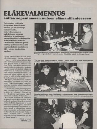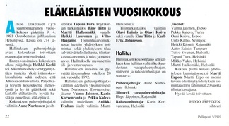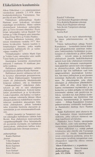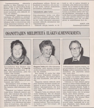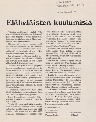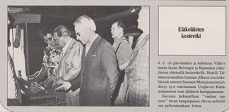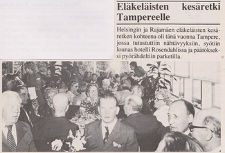 "Aprillipäivänä kokoontui pari sataa reipasta ja iloista eläkeläistä ikiomaan vuosikokoukseensa Vuorannan koulutuskeskukseen. Mieliala oli yleisesti katsoen mitä parhain."