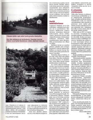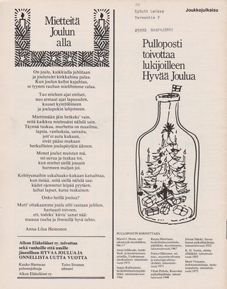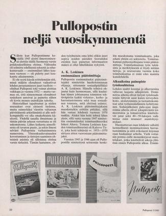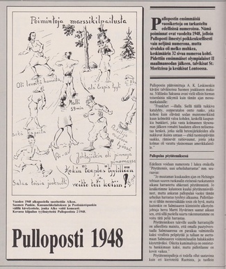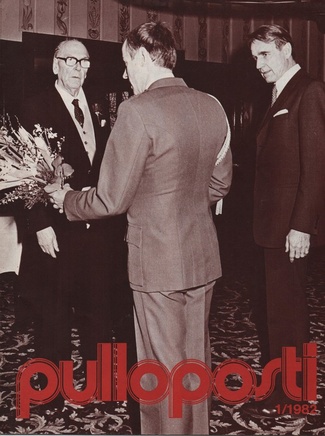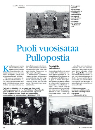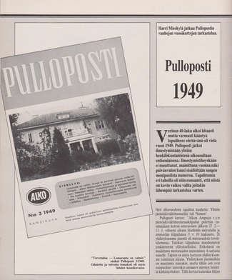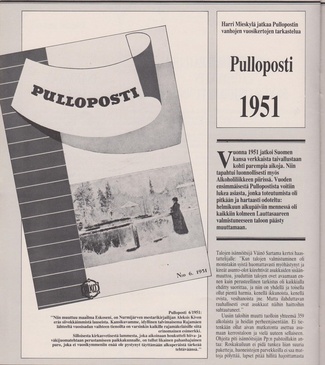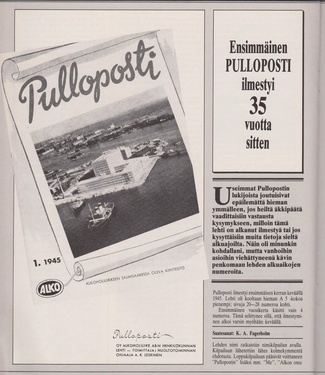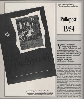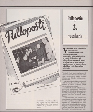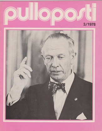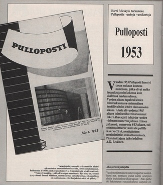 Kansikuvassa toukokuussa 1945 ilmestynyt Pullopostin ensimmäinen numero. Harri Mieskylän havaintoja "Puoli vuosisataa Pullopostia" sivulta 14 alkaen.
