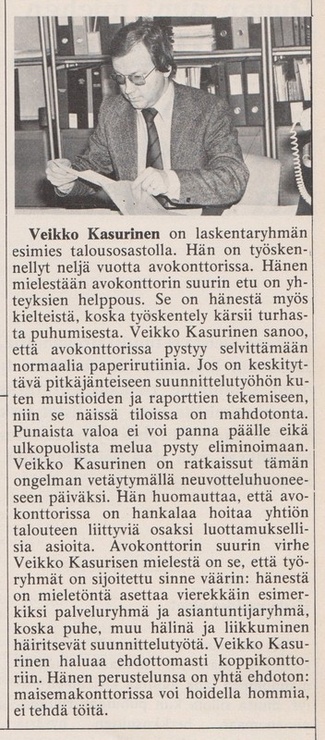 Talousosaston laskentaryhmän esimiehenä työskennellyt Veikko Kasurinen tiivisti mielipiteensä seuraavasti: "Maisemakonttorissa voi hoidella hommia, mutta ei tehdä töitä."