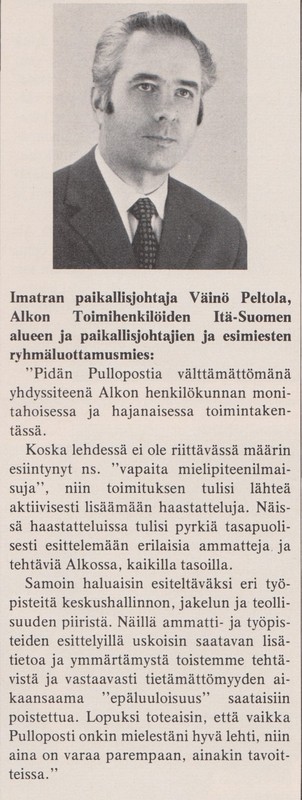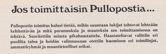 Kuten hyvin muistamme, Pulloposti oli aikaansa seuraava henkilöstölehti. Se halusi kehittää sisältöään lukijoiden toivomusten mukaisesti. Lukijoiden mielipidettä tiedusteltiin laajalla kyselyllä. Oheisena Peltolan Väinön kommentti.