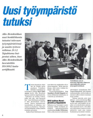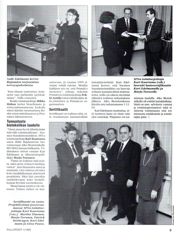Suomen Standarisoimisliitto luovutti Alkon Biotekniikalle sertifikaatin, joka on todistus siitä, että noudatetaan kansainvälistä laatujärjestelmää.