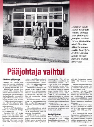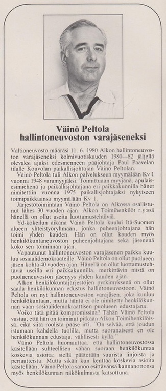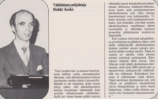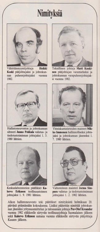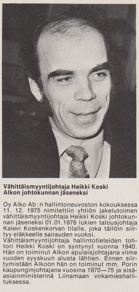 Syyskuun alussa 1975 Alkon apulaisjohtajaksi tuli Heikki Koski. Hallintoneuvosto nimitti johtokunnan jäseneksi jakelutoimen vähittäismyyntijohtaja Kosken 1.1.1976 alkaen.