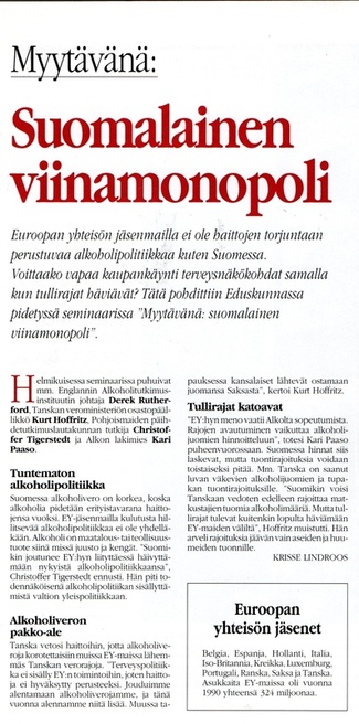 Karilla oli taito kirjoittaa kuivistakin asioista pieni pilke silmäkulmassa. Taustoja selvittäessään hän totesi, että kotimaassa haluttiin nähdä, että EU:n perussäädöstö ja suomalainen alkoholijärjestelmä eivät sovi yhteen. Perustettiin Heikki S. von Hetzenin työryhm selvittämään asiaa. Töryhmän ristipaineita lisäsi Ruotsin poukkoileva käytös. Suomen hallitukselle tuotti ylivoimaisia vaikeuksia päättää mitä se halusi asiassa.