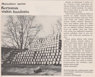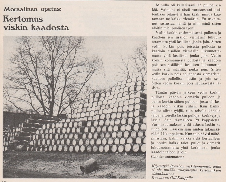 Tuntematon lähde oli kirjoittanut moraalisen opetuksen viskin kaadosta. Viskin omistajalla oli ollut kellarissaan 12 viskipulloa. Julma vaimo oli pakottanut miehensä kaatamaan viskit viemäriin. Niin myös tapahtui.