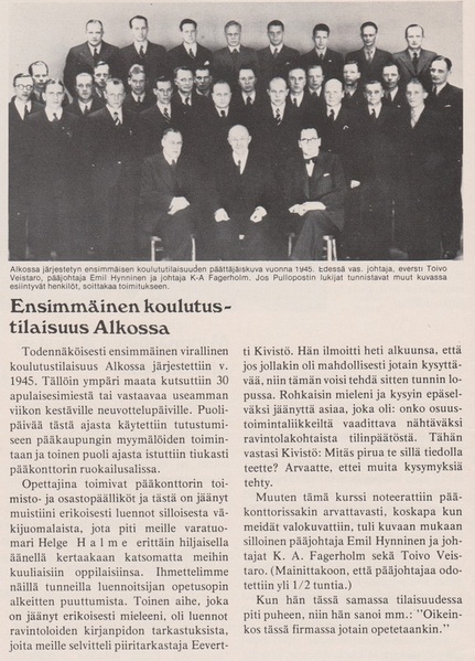 Toisessa kuvassa poseeraa Alkon silloisessa koulutuskeskus Lomarannssa pidetty myyjänkurssi vuodelta 1963. Pelkkiä kravattikaulaisia miehiä oli tälle kurssille kelpuutettu.