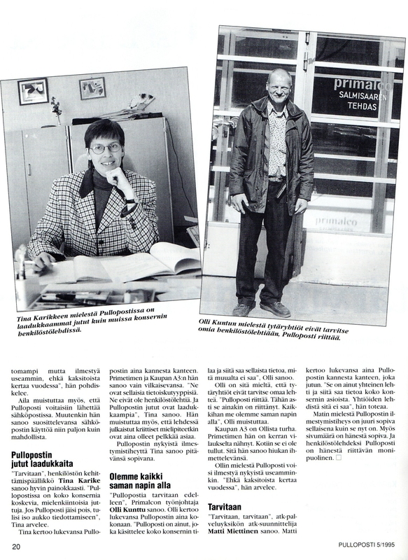 Pulloposti oli tarjonnut apuaan molemmalle yhtiölle. Primalcon kanssa oli jo sovittu, että Pullopostin toimitus toimittaa sille vuoden 1995 aikana kolme numeroa Primetime nimistä tiedotus- ja henkilöstölehteä. Jatkosta ei ollut mitään tietoa.