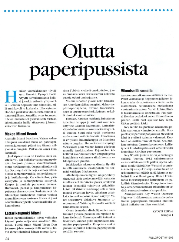 Pullopostin kirjeenvaihtaja oli piipahtanut Floridassa. Oheisena muisteloita tältä matkalta.