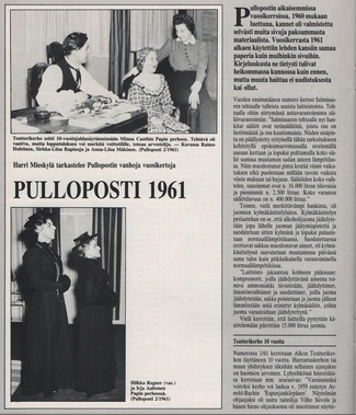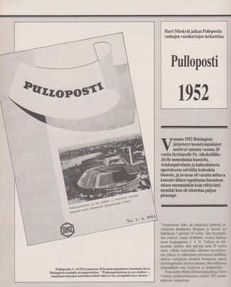 Yleinen havainto on, että Pulloposti oli alkanut pontevasti hankkia mainostuloja. Tässäkin lehdessä on keskiaukeamalla mahtava kahden sivun kokoinen Postipankin mainos ja 4 muuta mainosta. Alkon Teatterikerhon mainos lienee mennyt talon piikkiin.