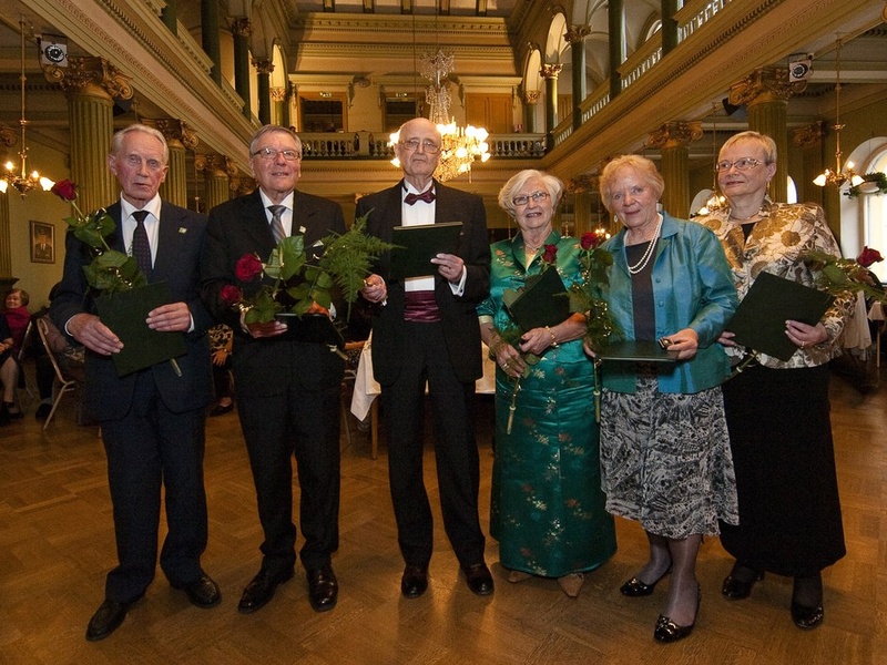 Ensimmäiset Kalervo Kosken suunnitteleman Alko-Altian Seniorit ry:n ansiomerkin saajat vuosikokouksessa 2010 Turun VPK:n talolla.